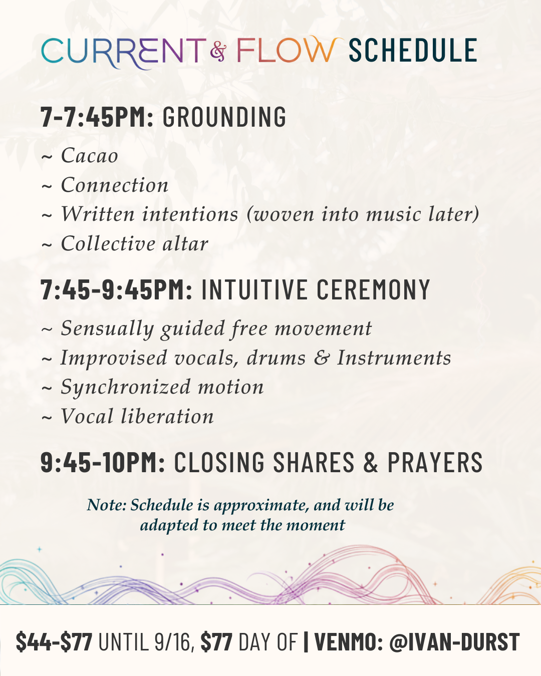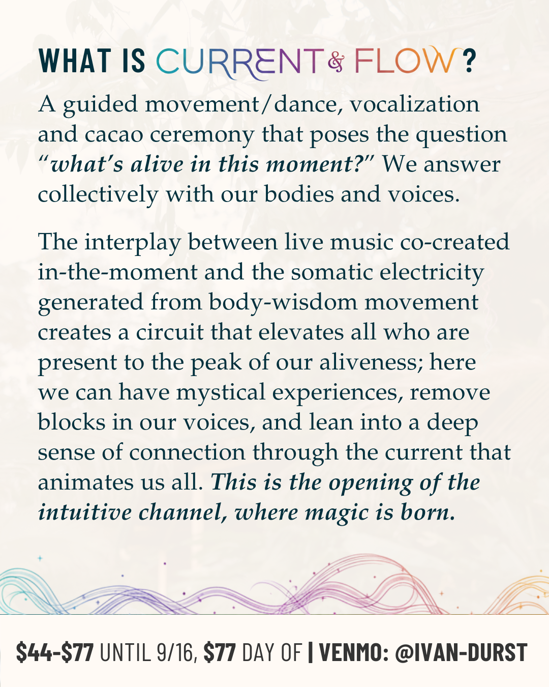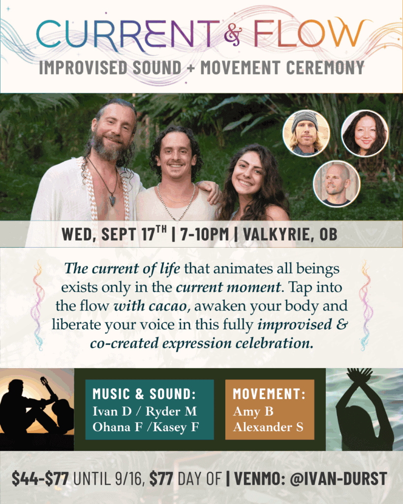 Tickets are sliding scale $44-$77 until 9/16 – they’ll be fixed at $77 day-of (get em early so we know how much cacao to prepare ☕️). Come plug in and charge up your life force 🔌